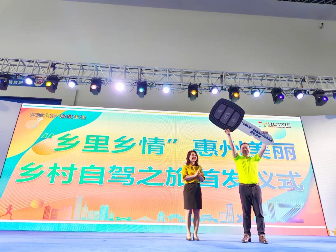 ▲惠州市文化廣電旅游體育局黨組書記局長鐘亮為“鄉(xiāng)里鄉(xiāng)情”惠州美麗鄉(xiāng)村自駕代表頒受啟動(dòng)鑰匙